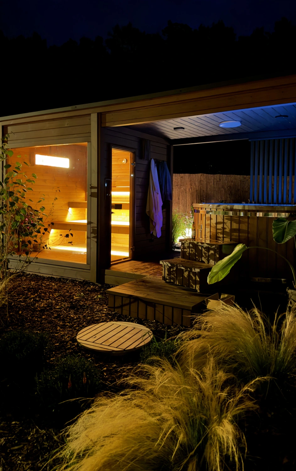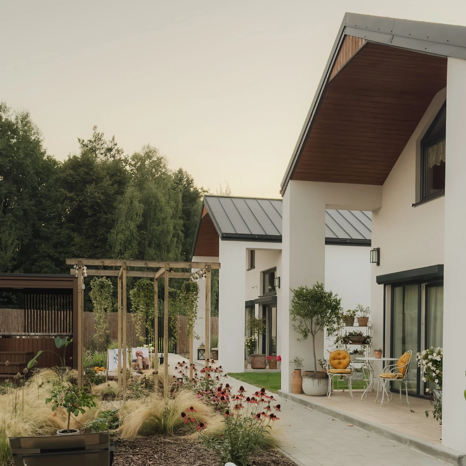 Cała przestrzeń, dwa domy, ogród, sauna i jacuzzi,